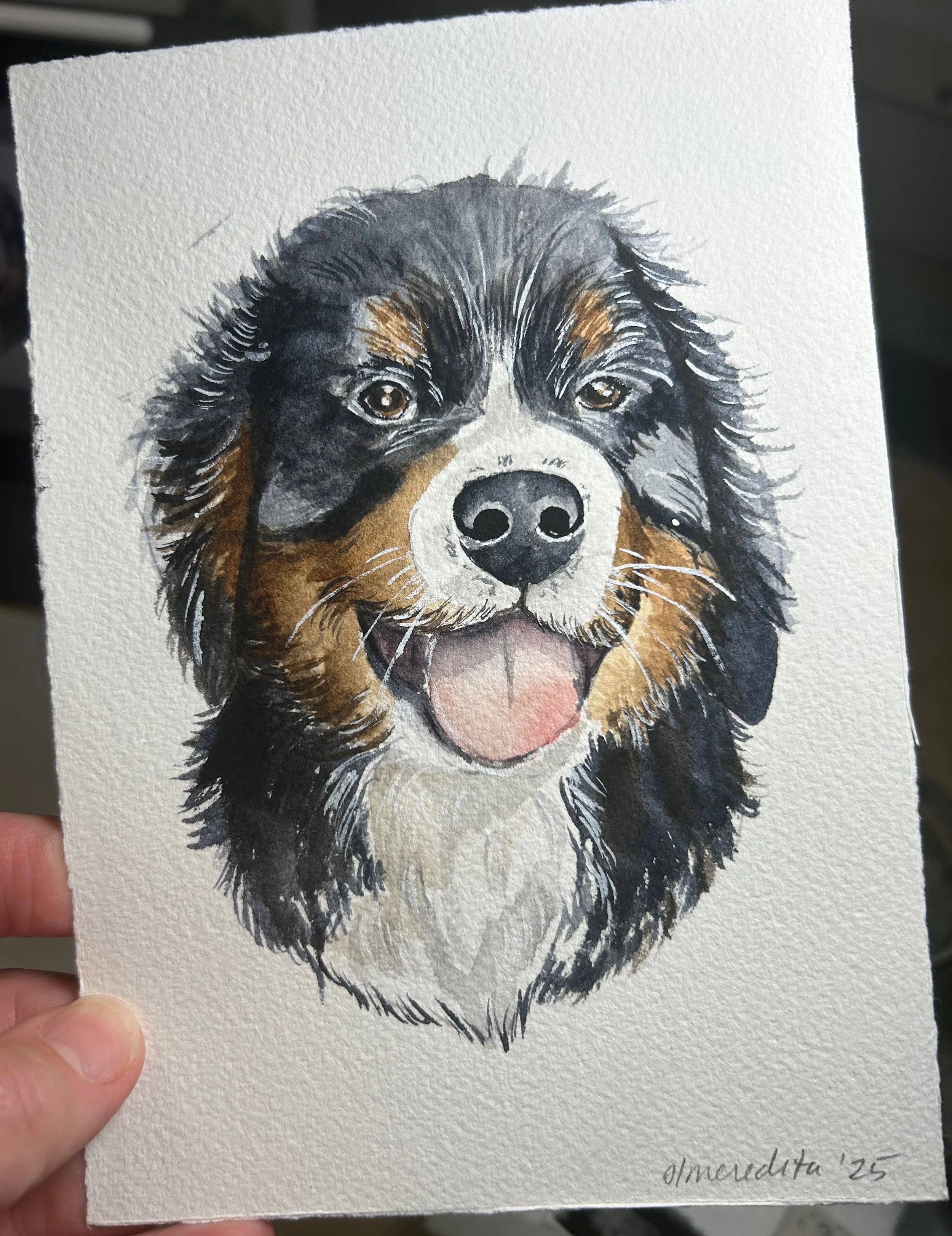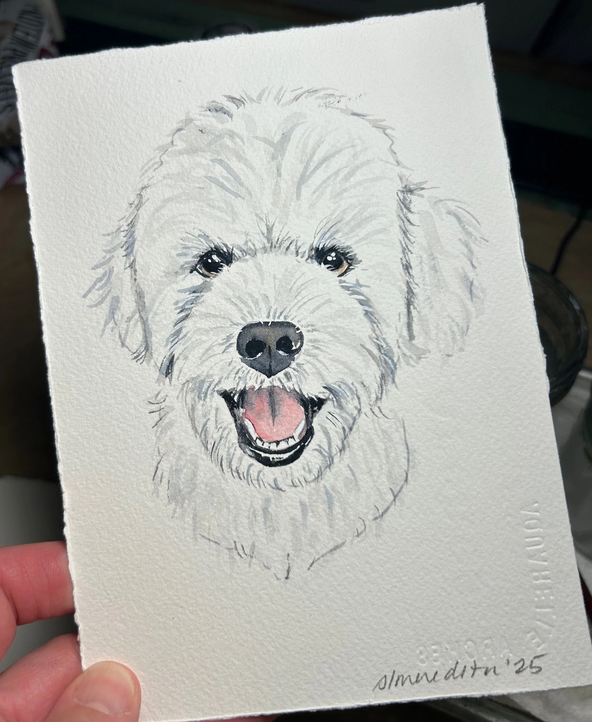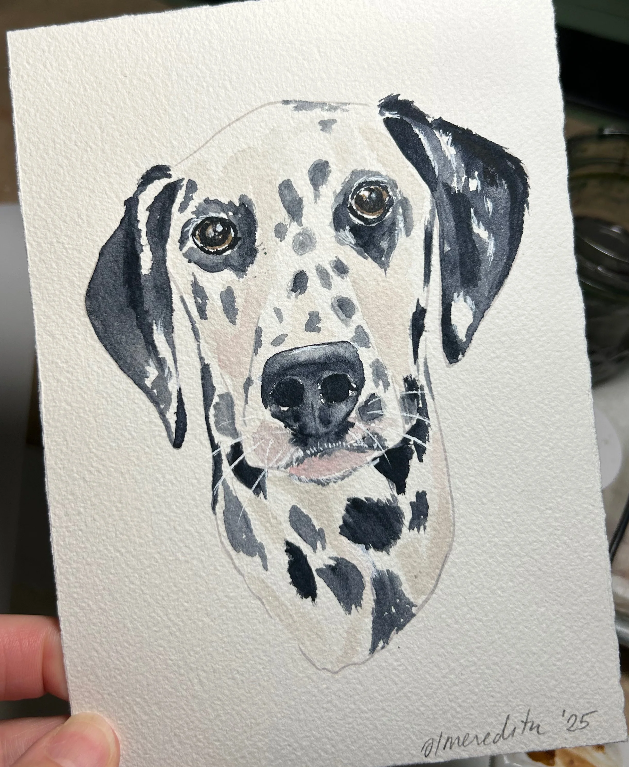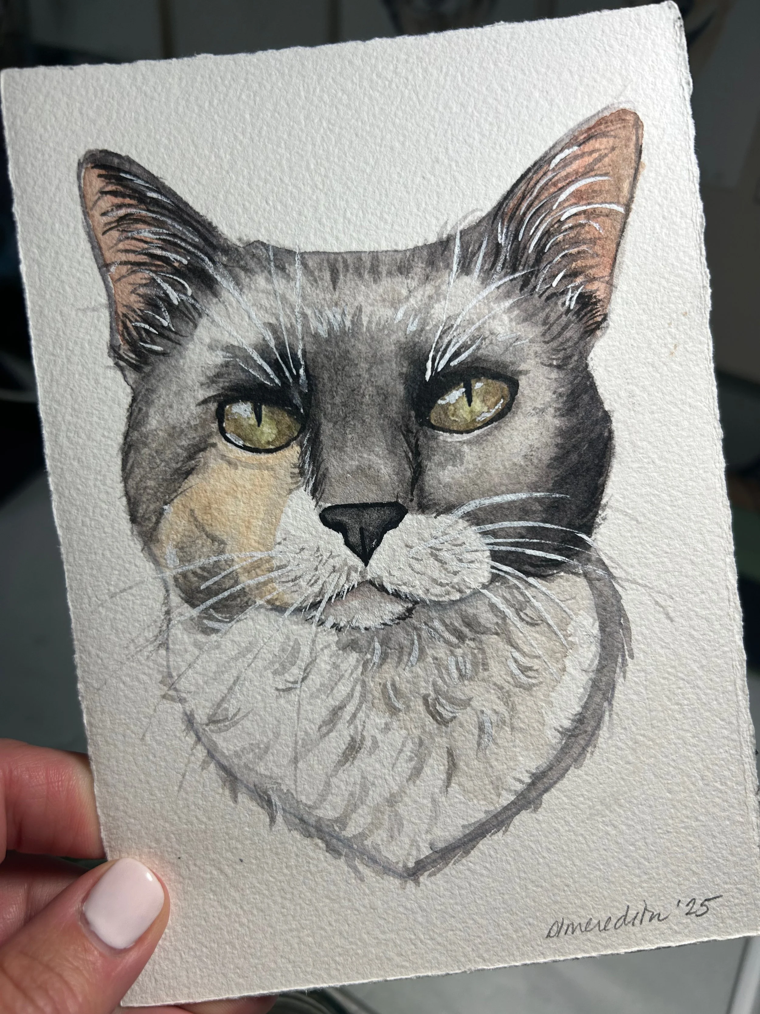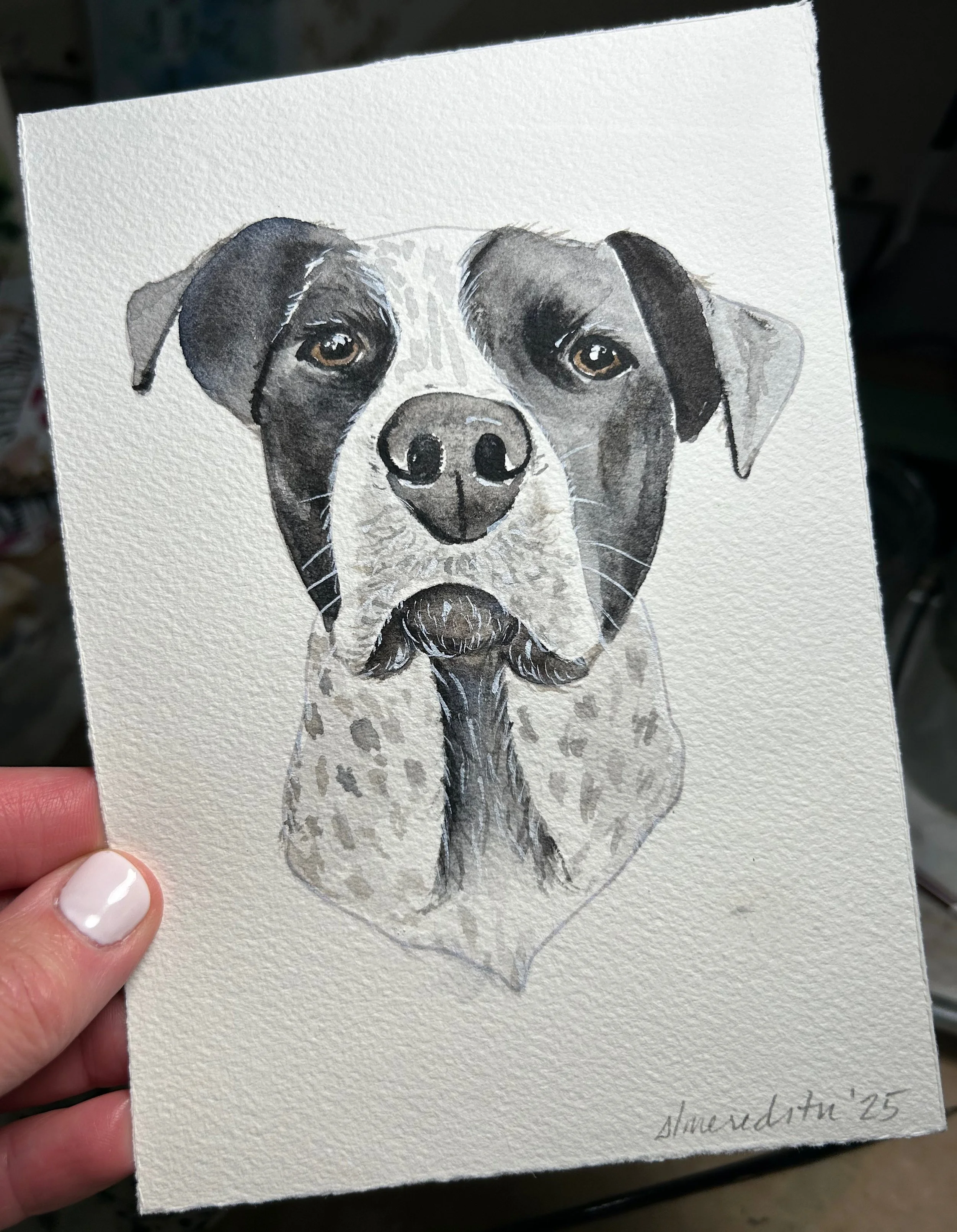 These representational portraits of your pet are done by hand in my unique art style and will vary from subject to subject. Because these are not large paintings, every detail can not be represented, but I strive to capture the personality and style of the pet. All of my custom portraits begin with a sketch on 140lb bright white, high-quality cold press watercolor paper and archival watercolor paint. I spend time on each portrait lovingly capturing details that make these a truly unique and special gift.