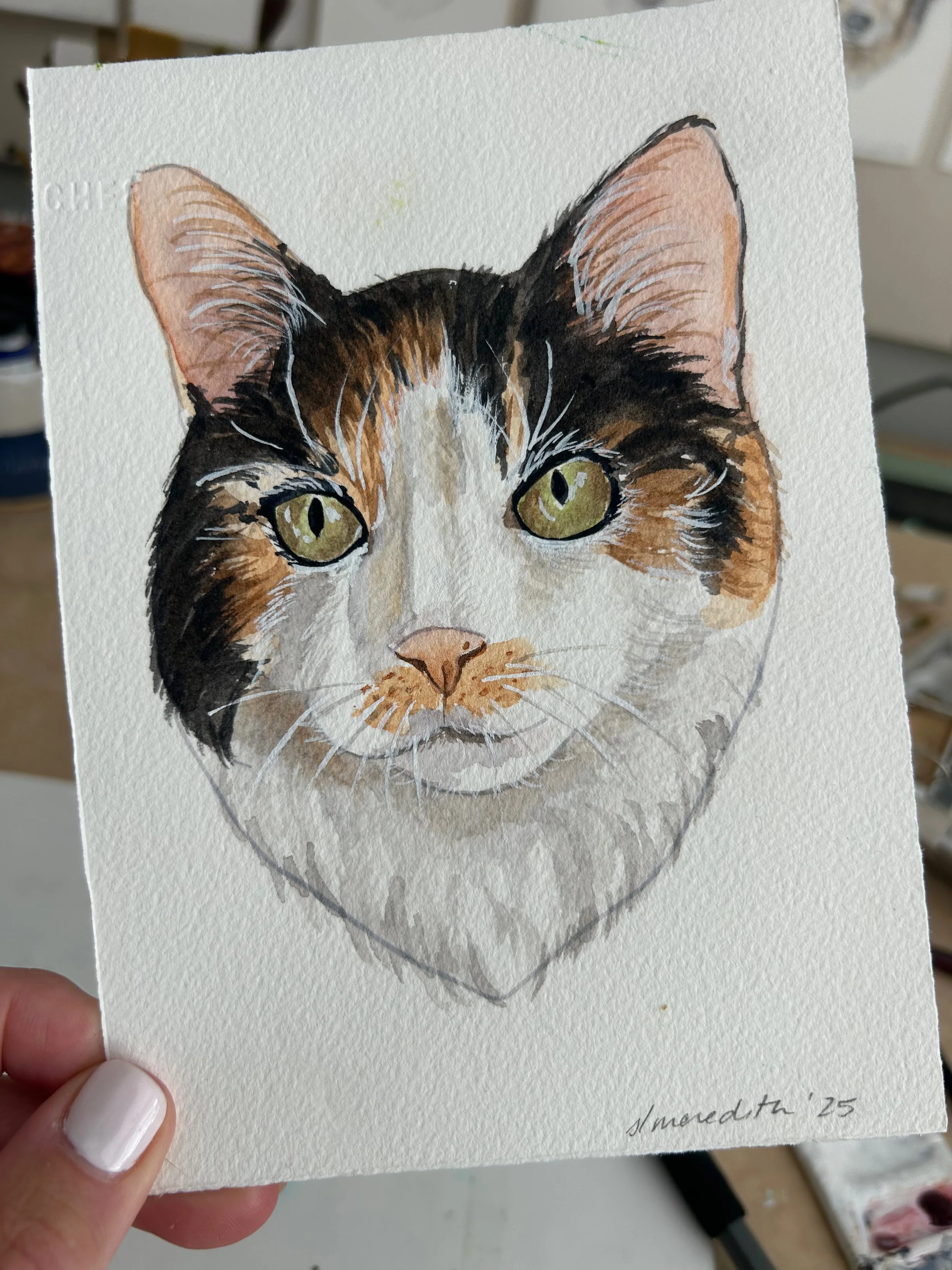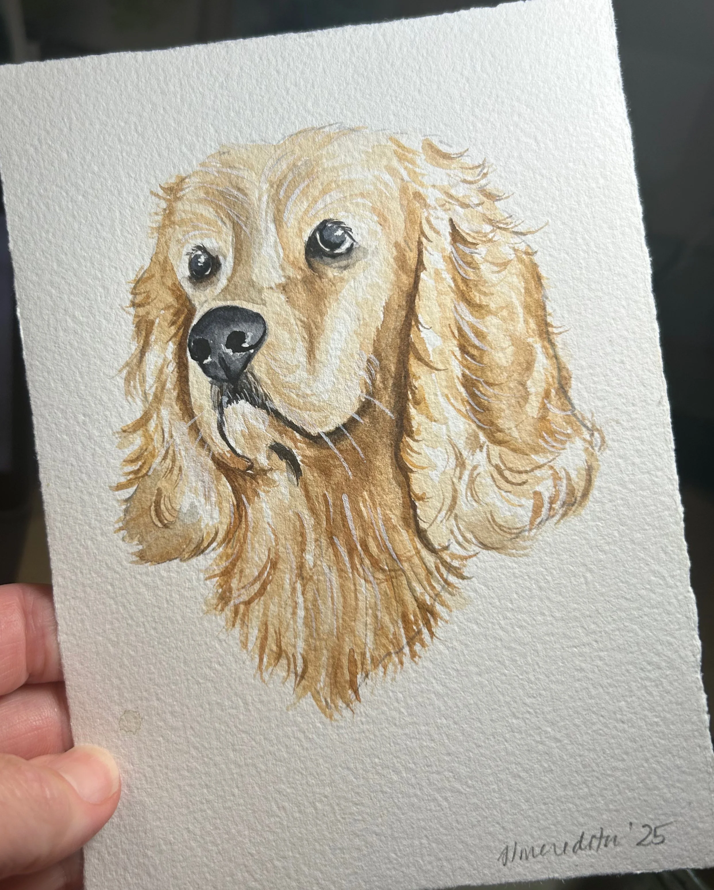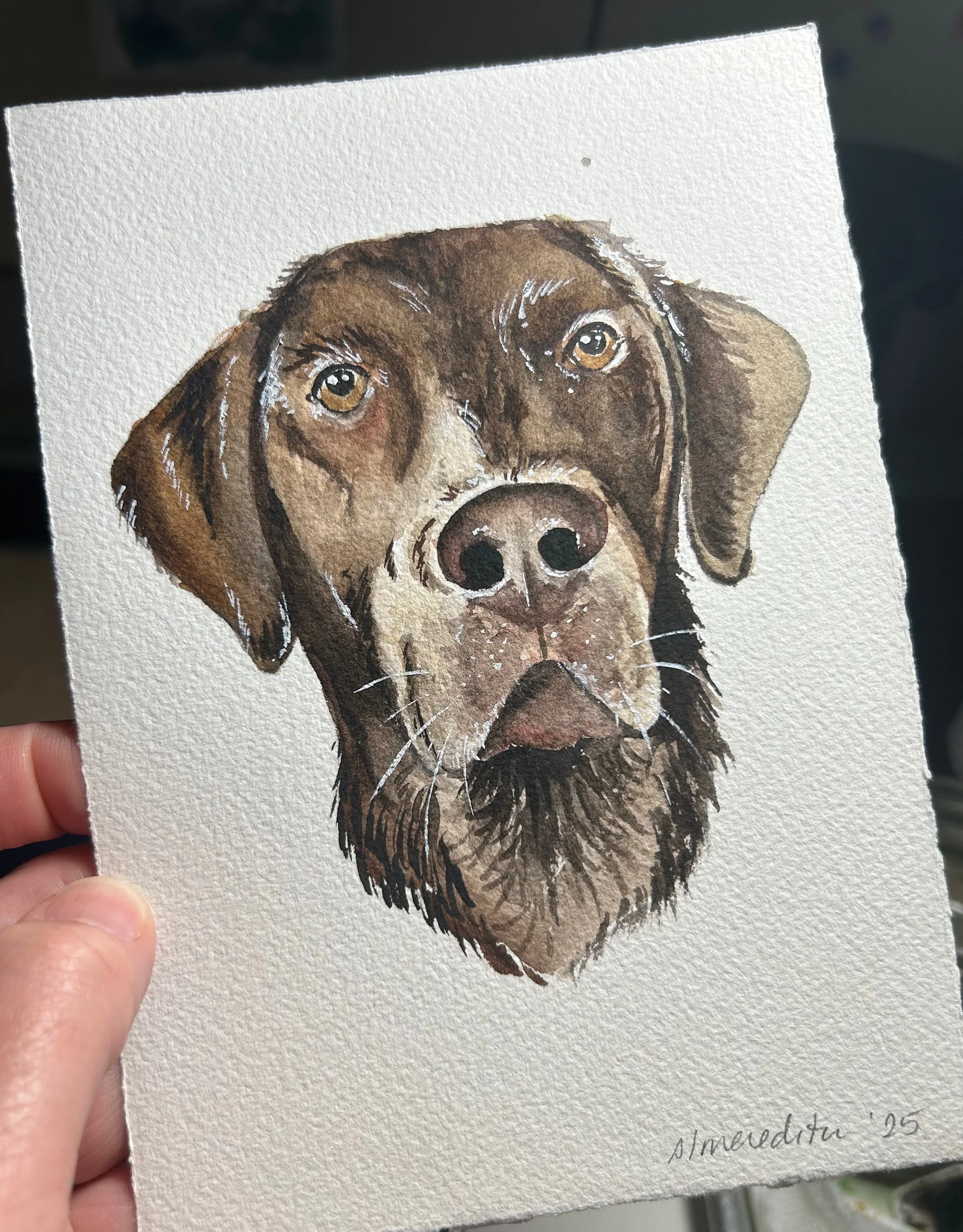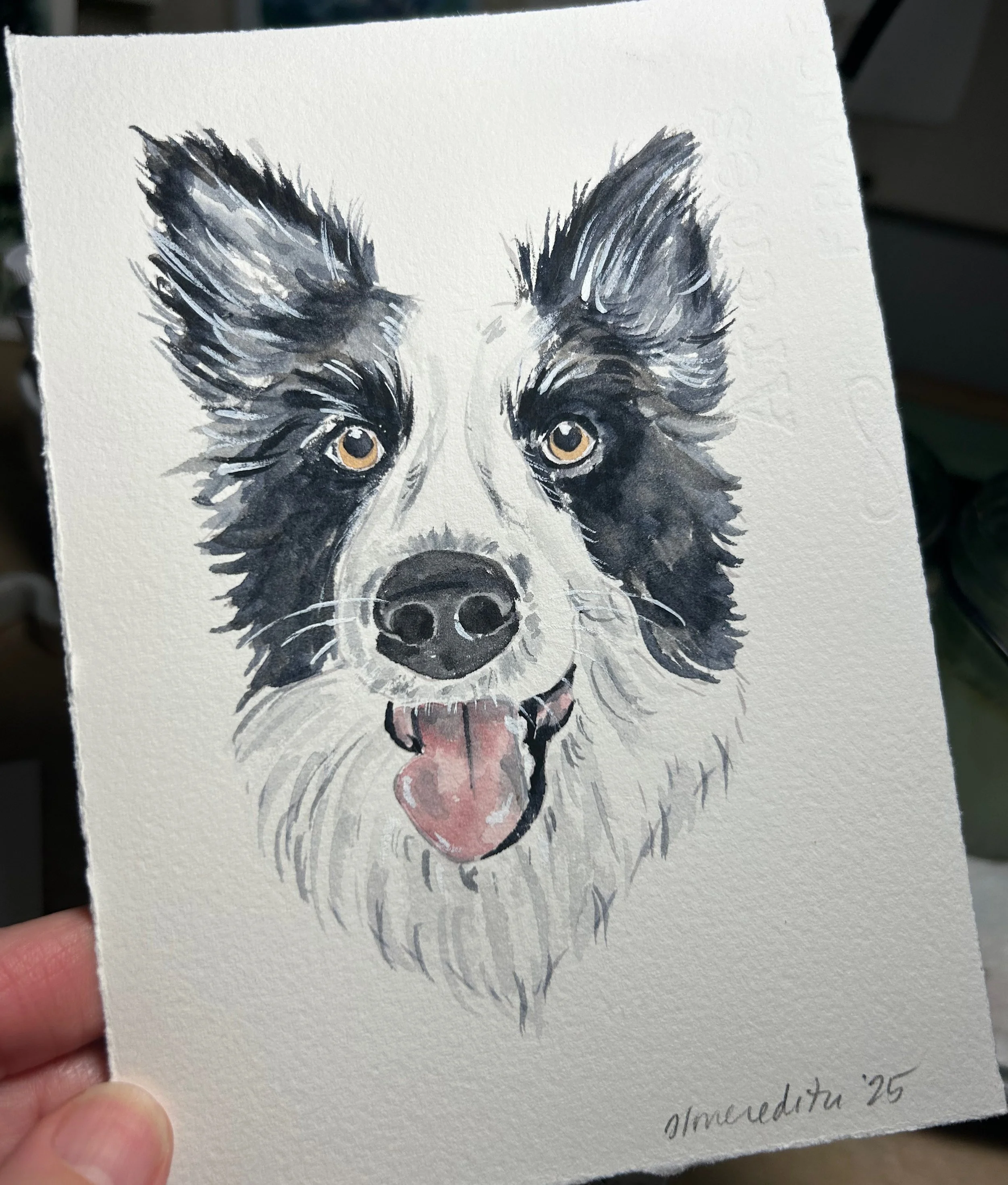 These representational portraits of your pet are done by hand in my unique art style and will vary from subject to subject. Because these are not large paintings, every detail can not be represented, but I strive to capture the personality and style of the pet. All of my custom portraits begin with a sketch on 140lb bright white, high-quality cold press watercolor paper and archival watercolor paint. I spend time on each portrait lovingly capturing details that make these a truly unique and special gift.